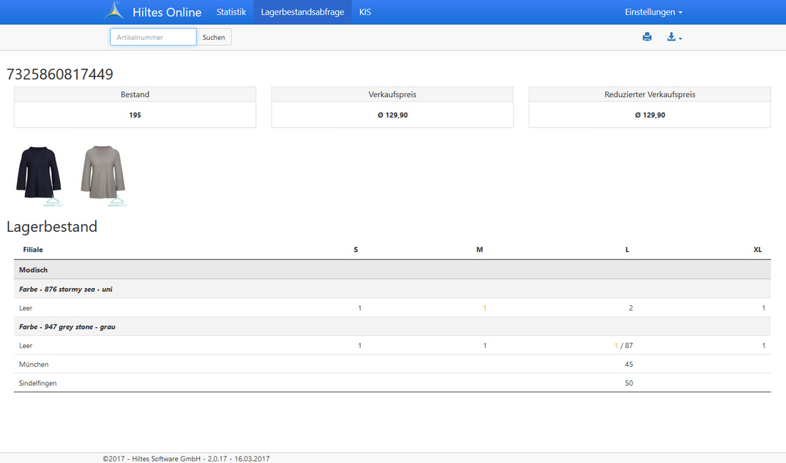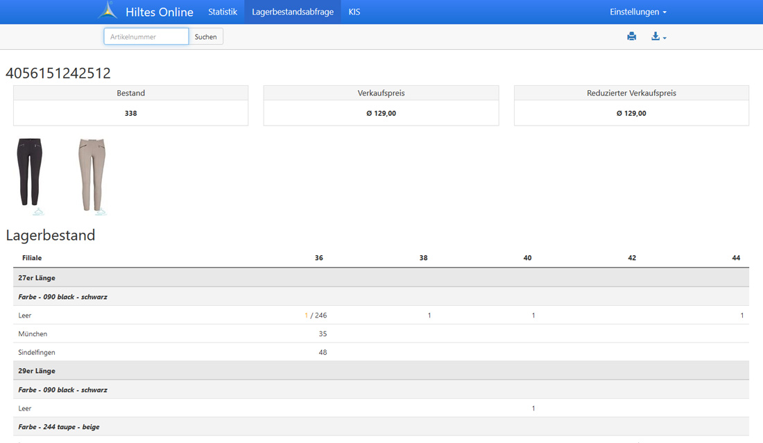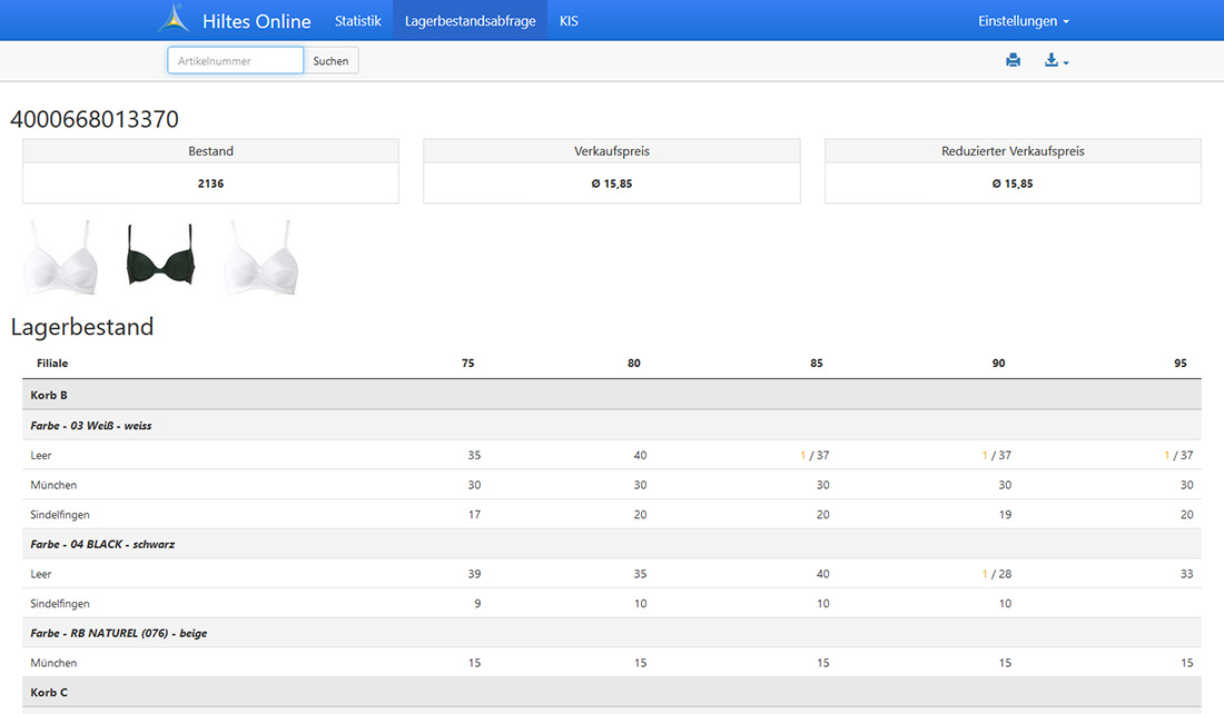 Bestandsauskunft mit Anzeige Filiale / Farbe / Größe / Preis (+Artikelbild). - Mobiles KIS