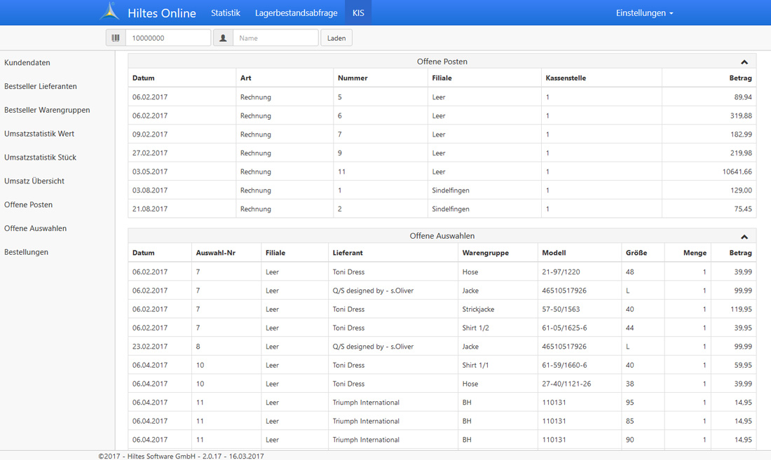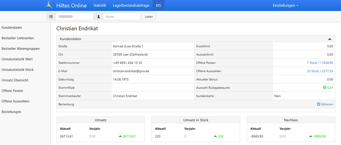 Anlage + Schnellauskunft eines Kunden mit Adresse/Geburtstag usw. und einer Übersicht Umsätze, Bestellungen, Auswahlen und offenen Posten.
